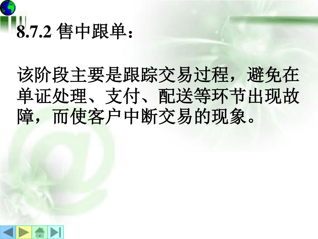 8.7.2 售中跟单: 该阶段主要是跟踪交易过程,避免在单证处理、支付、配送等环节出现故障,而使客户中断交易的现象。