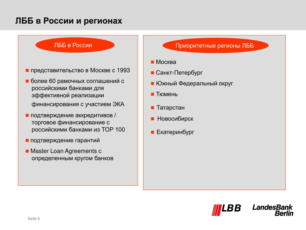 ЛББ в России и регионах ЛББ в России Приоритетные регионы ЛББ • представительство в Москве с 1993 • более 60 рамочных соглашений с российскими банками для эффективной реализации финансирования с участием ЭКА • подтверждение аккредитивов / торговое финансирование с российскими банками из ТОР 100 • подтверждение гарантий • Master Loan Agreements с определенным кругом банков Москва Санкт-Петербург Южный Федеральный округ Тюмень Татарстан Новосибирск Екатеринбург