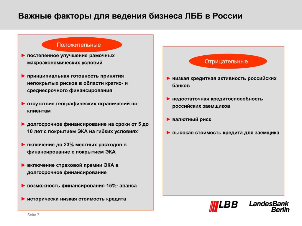 постепенное улучшение рамочных макроэкономических условий принципиальная готовность принятия непокрытых рисков в области кратко- и среднесрочного финансирования отсутствие географических ограничений по клиентам долгосрочное финансирование на сроки от 5 до 10 лет с покрытием ЭКА на гибких условиях включение до 23% местных расходов в финансирование с покрытием ЭКА включение страховой премии ЭКА в долгосрочное финансирование возможность финансирования 15%- аванса исторически низкая стоимость кредита низкая кредитная активность российских банков недостаточная кредитоспособность российских заемщиков валютный риск высокая стоимость кредита для заемщика Важные факторы для ведения бизнеса ЛББ в России Положительные Положительные Отрицательные