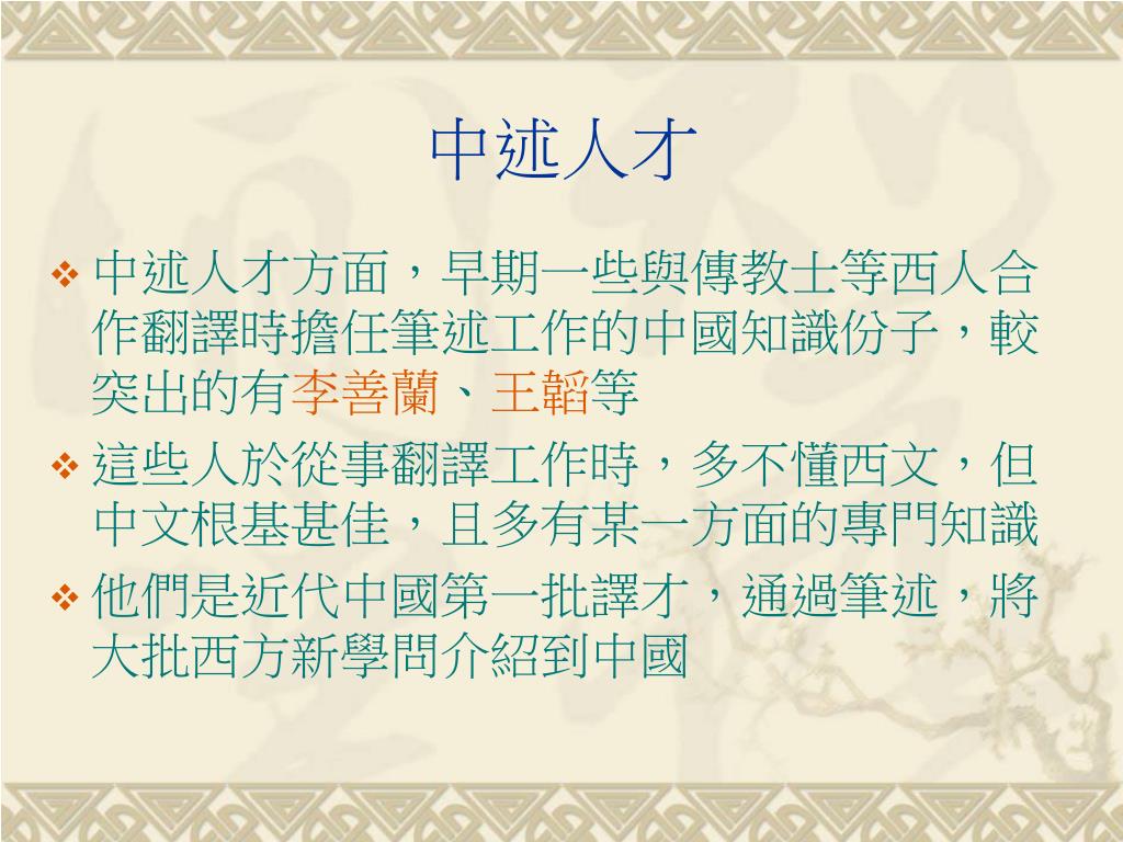中述人才 • 中述人才方面,早期一些與傳教士等西人合作翻譯時擔任筆述工作的中國知識份子,較突出的有李善蘭、王韜等 • 這些人於從事翻譯工作時,多不懂西文,但中文根基甚佳,且多有某一方面的專門知識 • 他們是近代中國第一批譯才,通過筆述,將大批西方新學問介紹到中國