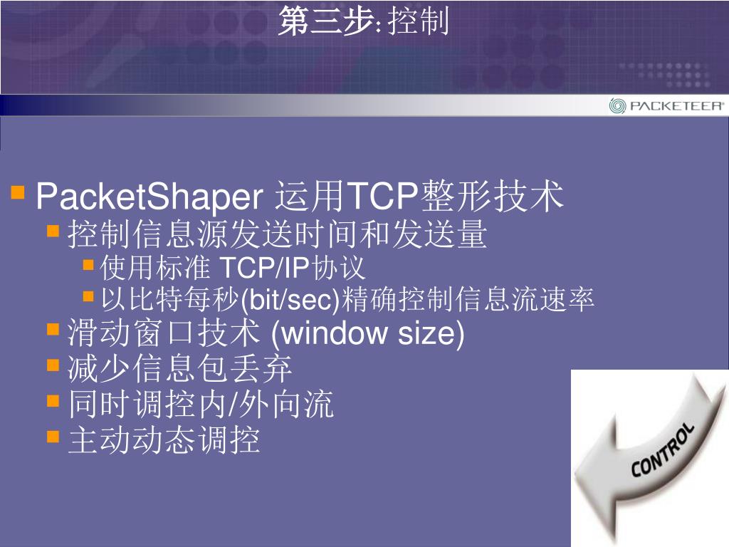 第三步: 控制 • PacketShaper 运用TCP整形技术 • 控制信息源发送时间和发送量 • 使用标准 TCP/IP协议 • 以比特每秒(bit/sec)精确控制信息流速率 • 滑动窗口技术 (window size) • 减少信息包丢弃 • 同时调控内/外向流 • 主动动态调控