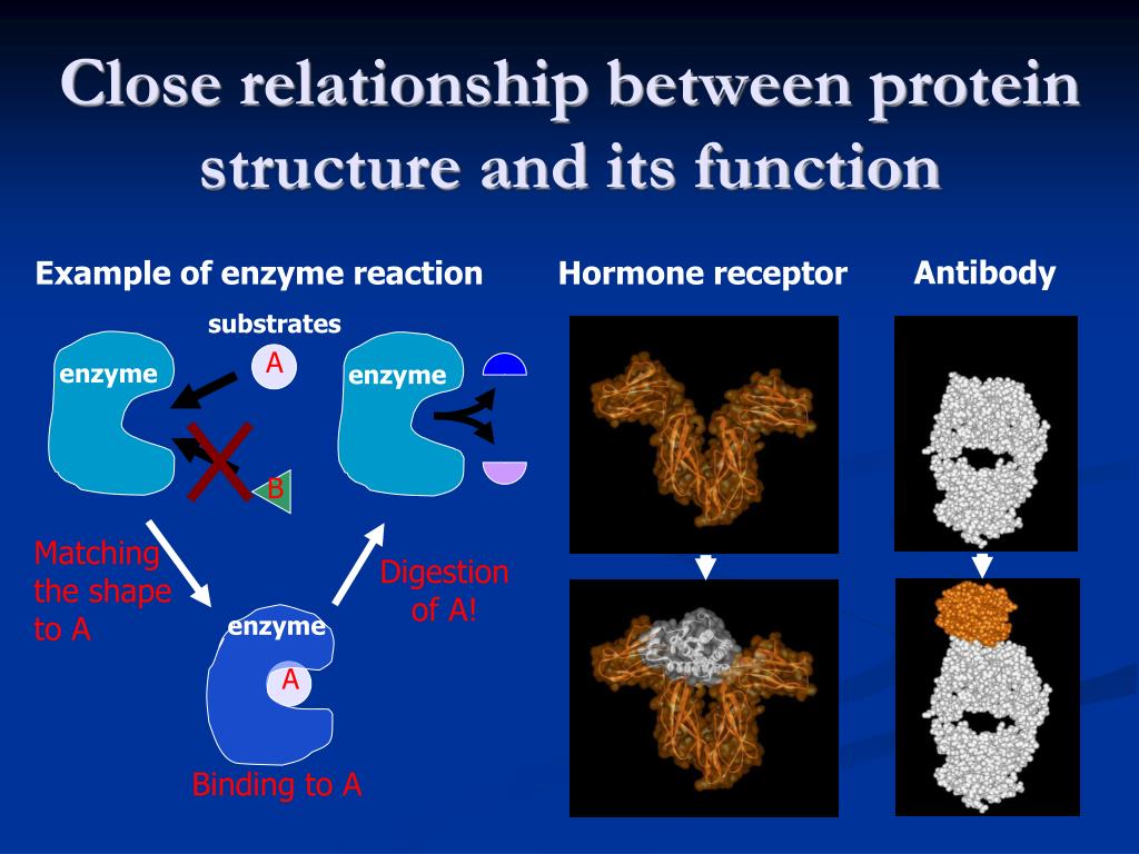 Close relationship between protein structure and its function Antibody Hormone receptor Example of enzyme reaction substrates A enzyme enzyme B Matching the shape to A Digestion of A! enzyme A Binding to A