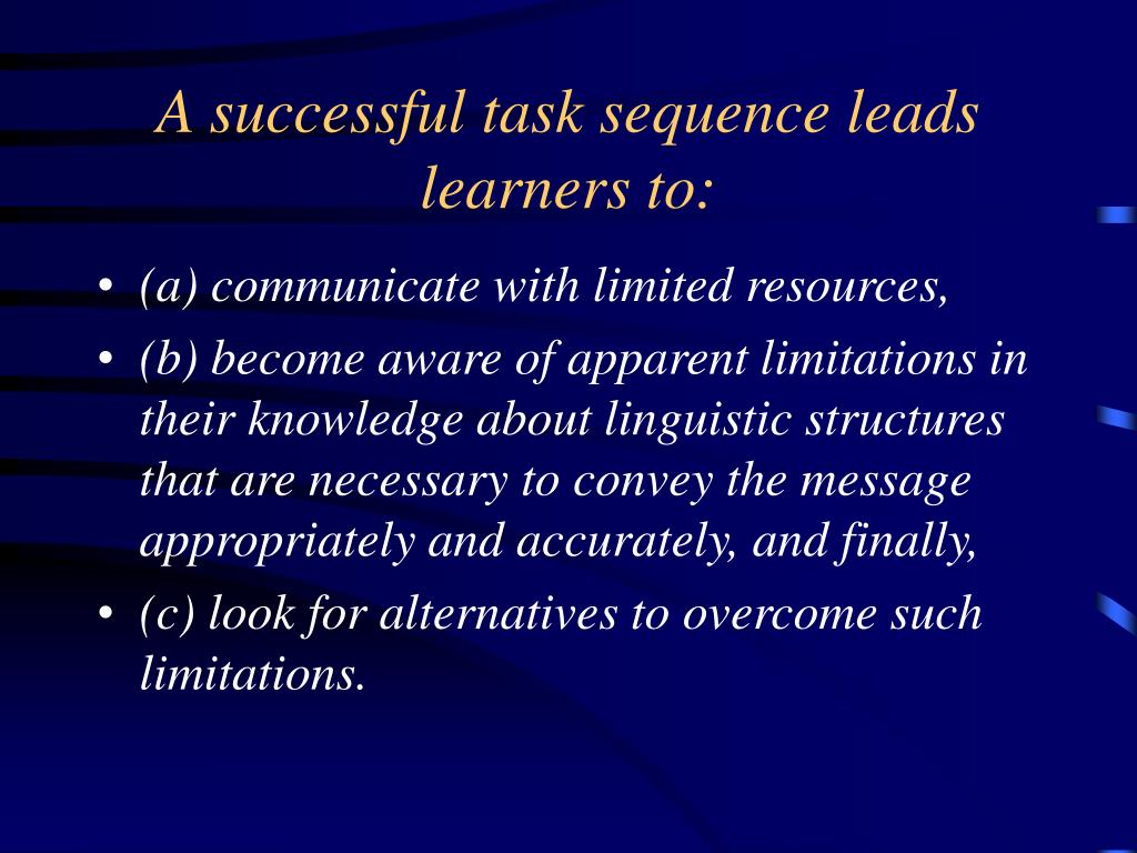 A successful task sequence leads learners to: • (a) communicate with limited resources, • (b) become aware of apparent limitations in their knowledge about linguistic structures that are necessary to convey the message appropriately and accurately, and finally, • (c) look for alternatives to overcome such limitations.