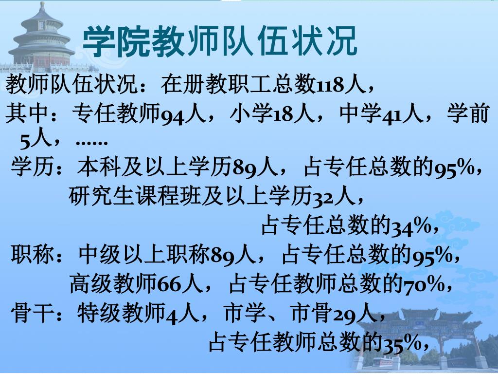 学院教师队伍状况 教师队伍状况:在册教职工总数118人, 其中:专任教师94人,小学18人,中学41人,学前5人,…… 学历:本科及以上学历89人,占专任总数的95%, 研究生课程班及以上学历32人, 占专任总数的34%, 职称:中级以上职称89人,占专任总数的95%, 高级教师66人,占专任教师总数的70%, 骨干:特级教师4人,市学、市骨29人, 占专任教师总数的35%,