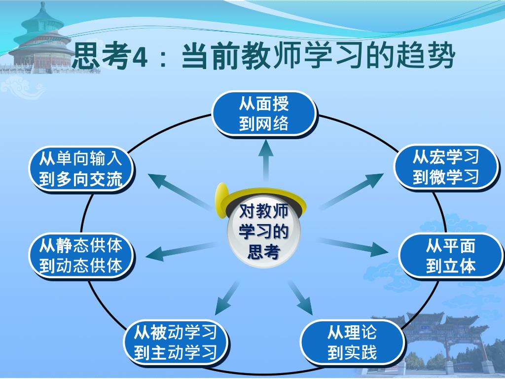 思考4:当前教师学习的趋势 从面授 到网络 从宏学习 到微学习 从单向输入 到多向交流 对教师 学习的 思考 从静态供体 到动态供体 从平面 到立体 从被动学习 到主动学习 从理论 到实践