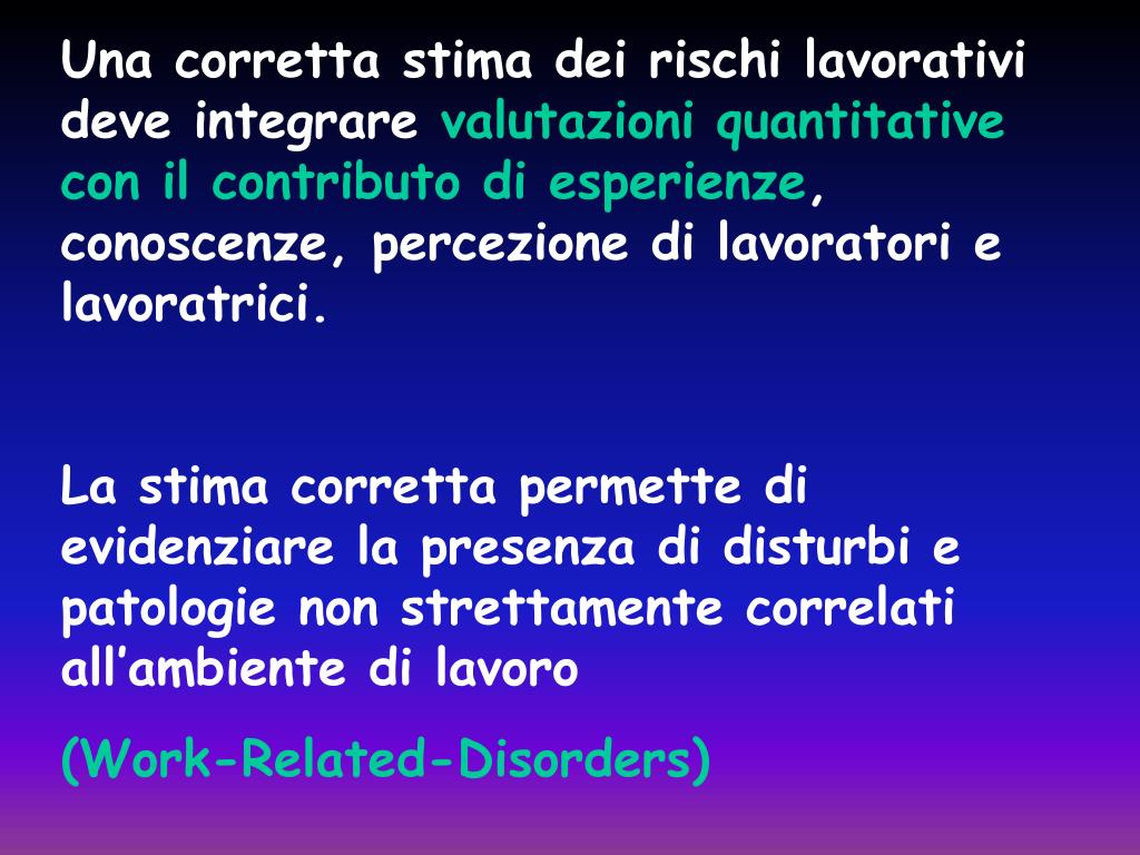 Una corretta stima dei rischi lavorativi deve integrare valutazioni quantitativecon il contributo di esperienze, conoscenze, percezione di lavoratori e lavoratrici. La stima corretta permette di evidenziare la presenza di disturbi e patologie non strettamente correlati all’ambiente di lavoro (Work-Related-Disorders)