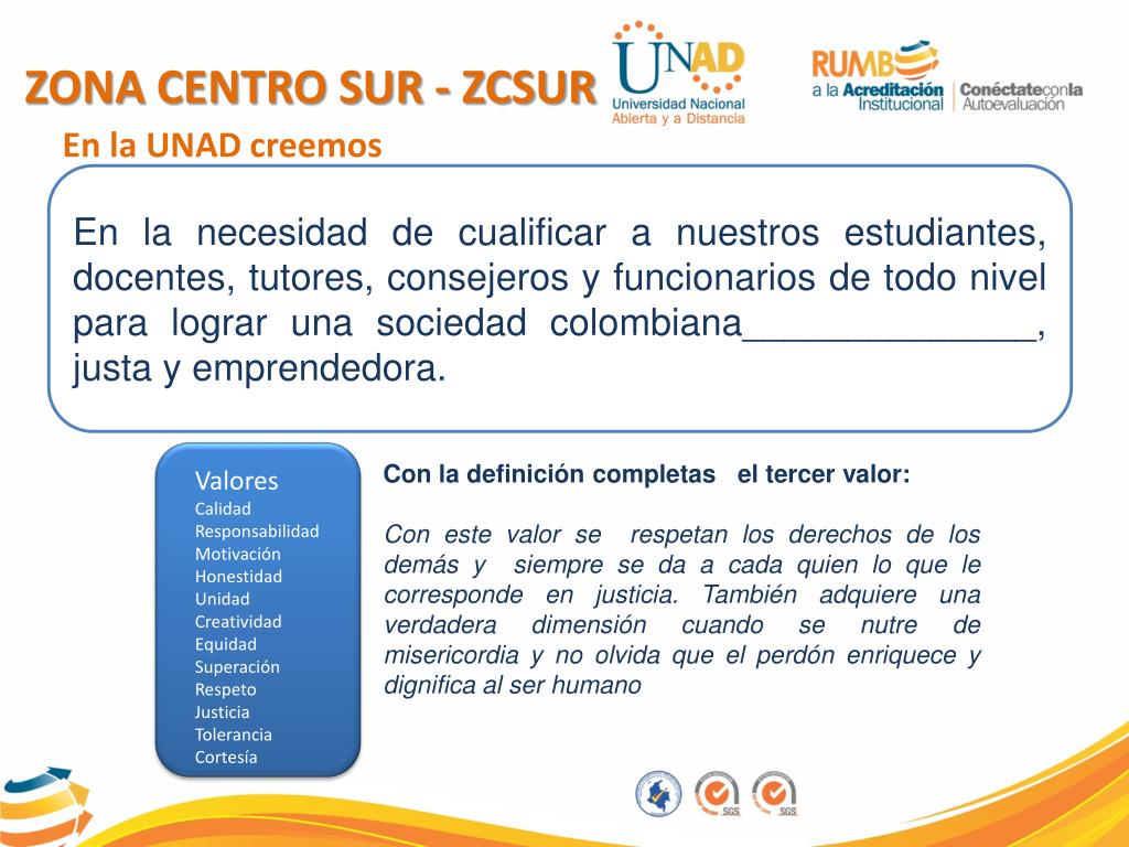 ZONA CENTRO SUR - ZCSUR En la UNAD creemos En la necesidad de cualificar a nuestros estudiantes, docentes, tutores, consejeros y funcionarios de todo nivel para lograr una sociedad colombiana______________, justa y emprendedora. Con la definición completas el tercer valor: Con este valor se respetan los derechos de los demás y siempre se da a cada quien lo que le corresponde en justicia. También adquiere una verdadera dimensión cuando se nutre de misericordia y no olvida que el perdón enriquece y dignifica al ser humano Valores Calidad Responsabilidad Motivación Honestidad Unidad Creatividad Equidad Superación Respeto Justicia Tolerancia Cortesía