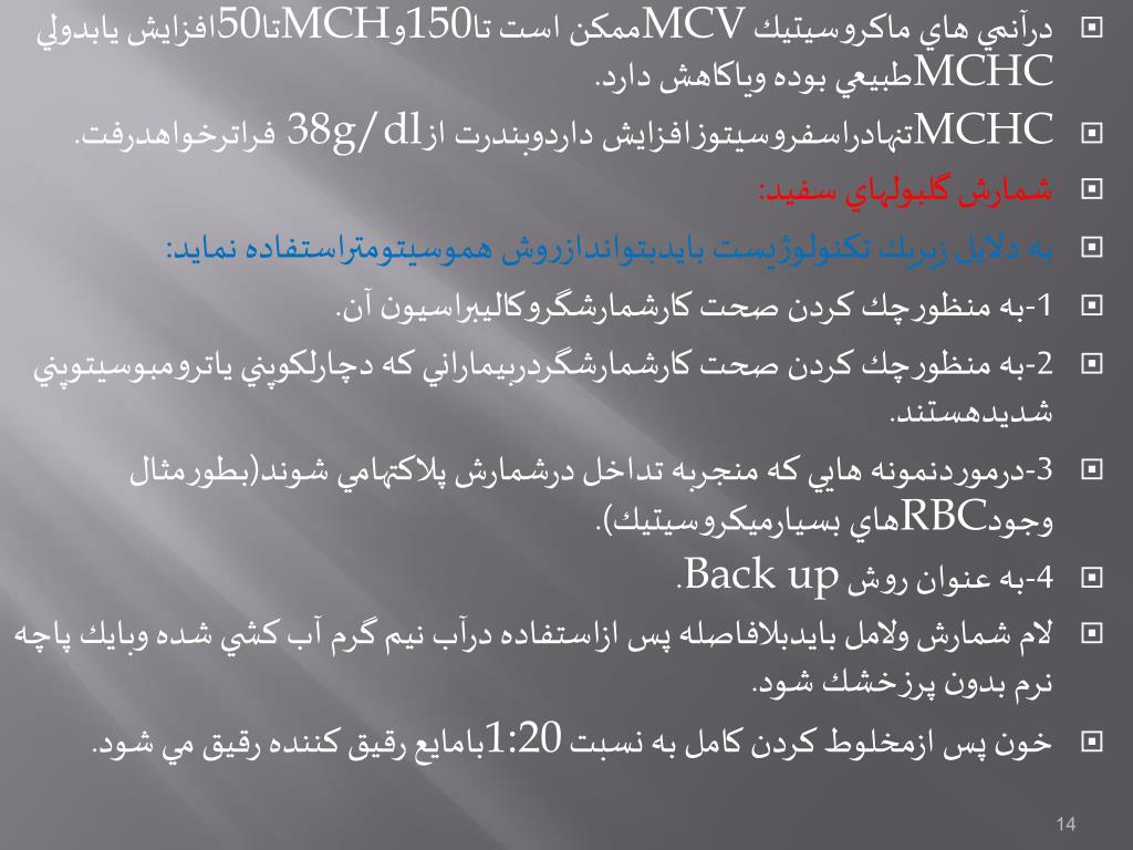 درآنمي هاي ماكروسيتيك MCVممكن است تا150وMCHتا50افزايش يابدولي MCHCطبيعي بوده وياكاهش دارد. • MCHCتنهادراسفروسيتوزافزايش داردوبندرت از 38g/dlفراترخواهدرفت. • شمارش گلبولهاي سفيد: • به دلايل زيريك تكنولوژيست بايدبتواندازروش هموسيتومتراستفاده نمايد: • 1-به منظورچك كردن صحت كارشمارشگروكاليبراسيون آن. • 2-به منظورچك كردن صحت كارشمارشگردربيماراني كه دچارلكوپني ياترومبوسيتوپني شديدهستند. • 3-درموردنمونه هايي كه منجربه تداخل درشمارش پلاكتهامي شوند(بطورمثال وجودRBCهاي بسيارميكروسيتيك). • 4-به عنوان روش Back up. • لام شمارش ولامل بايدبلافاصله پس ازاستفاده درآب نيم گرم آب كشي شده وبايك پاچه نرم بدون پرزخشك شود. • خون پس ازمخلوط كردن كامل به نسبت 1:20بامايع رقيق كننده رقيق مي شود.