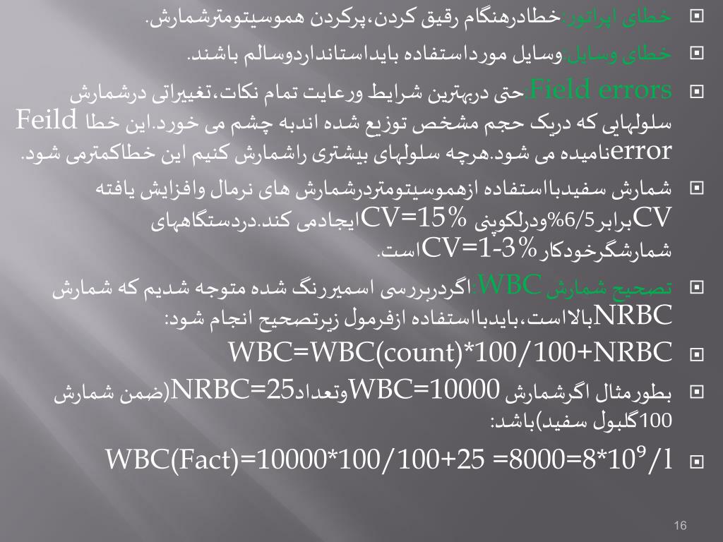 خطای اپراتور:خطادرهنگام رقیق کردن،پرکردن هموسیتومترشمارش. • خطای وسایل:وسایل مورداستفاده بایداستانداردوسالم باشند. • Field errors:حتی دربهترین شرایط ورعایت تمام نکات،تغییراتی درشمارش سلولهایی که دریک حجم مشخص توزیع شده اندبه چشم می خورد.این خطاFeild errorنامیده می شود.هرچه سلولهای بیشتری راشمارش کنیم این خطاکمترمی شود. • شمارش سفیدبااستفاده ازهموسیتومتردرشمارش های نرمال وافزایش یافته CVبرابر6/5%ودرلکوپنی CV=15%ایجادمی کند.دردستگاههای شمارشگرخودکارCV=1-3%است. • تصحیح شمارش WBC:اگردربررسی اسمیررنگ شده متوجه شدیم که شمارش NRBCبالااست،بایدبااستفاده ازفرمول زیرتصحیح انجام شود: • WBC=WBC(count)*100/100+NRBC • بطورمثال اگرشمارش WBC=10000وتعدادNRBC=25(ضمن شمارش 100گلبول سفید)باشد: • WBC(Fact)=10000*100/100+25 =8000=8*10⁹/l