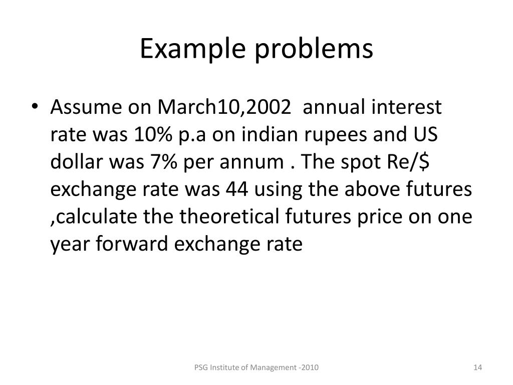Example problems • Assume on March10,2002 annual interest rate was 10% p.a on indian rupees and US dollar was 7% per annum . The spot Re/$ exchange rate was 44 using the above futures ,calculate the theoretical futures price on one year forward exchange rate PSG Institute of Management -2010