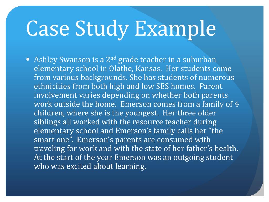 Case Study Example • Ashley Swanson is a 2nd grade teacher in a suburban elementary school in Olathe, Kansas. Her students come from various backgrounds. She has students of numerous ethnicities from both high and low SES homes. Parent involvement varies depending on whether both parents work outside the home. Emerson comes from a family of 4 children, where she is the youngest. Her three older siblings all worked with the resource teacher during elementary school and Emerson’s family calls her “the smart one”. Emerson’s parents are consumed with traveling for work and with the state of her father’s health. At the start of the year Emerson was an outgoing student who was excited about learning.