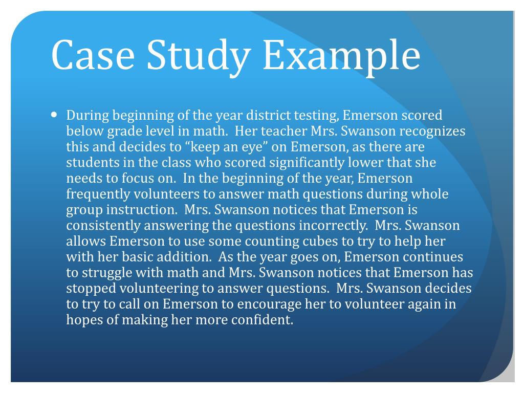 Case Study Example • During beginning of the year district testing, Emerson scored below grade level in math. Her teacher Mrs. Swanson recognizes this and decides to “keep an eye” on Emerson, as there are students in the class who scored significantly lower that she needs to focus on. In the beginning of the year, Emerson frequently volunteers to answer math questions during whole group instruction. Mrs. Swanson notices that Emerson is consistently answering the questions incorrectly. Mrs. Swanson allows Emerson to use some counting cubes to try to help her with her basic addition. As the year goes on, Emerson continues to struggle with math and Mrs. Swanson notices that Emerson has stopped volunteering to answer questions. Mrs. Swanson decides to try to call on Emerson to encourage her to volunteer again in hopes of making her more confident.