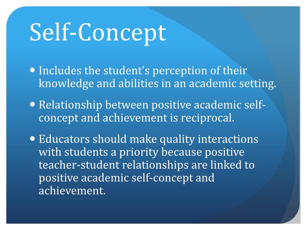 Self-Concept • Includes the student’s perception of their knowledge and abilities in an academic setting. • Relationship between positive academic self-concept and achievement is reciprocal. • Educators should make quality interactions with students a priority because positive teacher-student relationships are linked to positive academic self-concept and achievement.