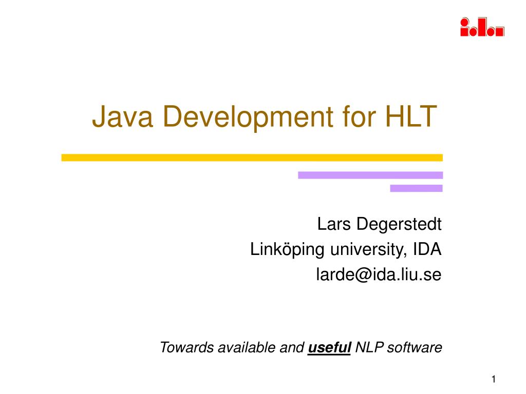Java Development for HLT Lars Degerstedt Linköping university, IDA larde@ida.liu.se Towards available and usefulNLP software