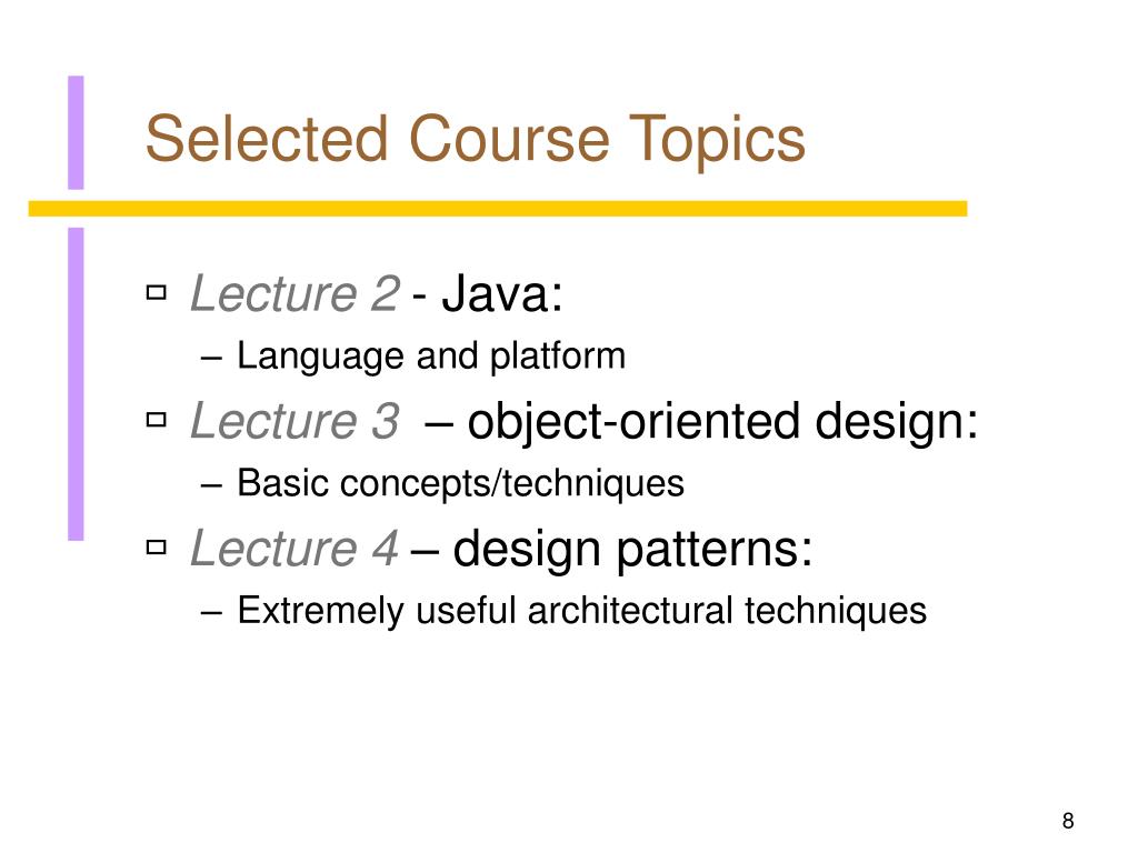 Selected Course Topics • Lecture 2 - Java: • Language and platform • Lecture 3 – object-oriented design: • Basic concepts/techniques • Lecture 4 – design patterns: • Extremely useful architectural techniques
