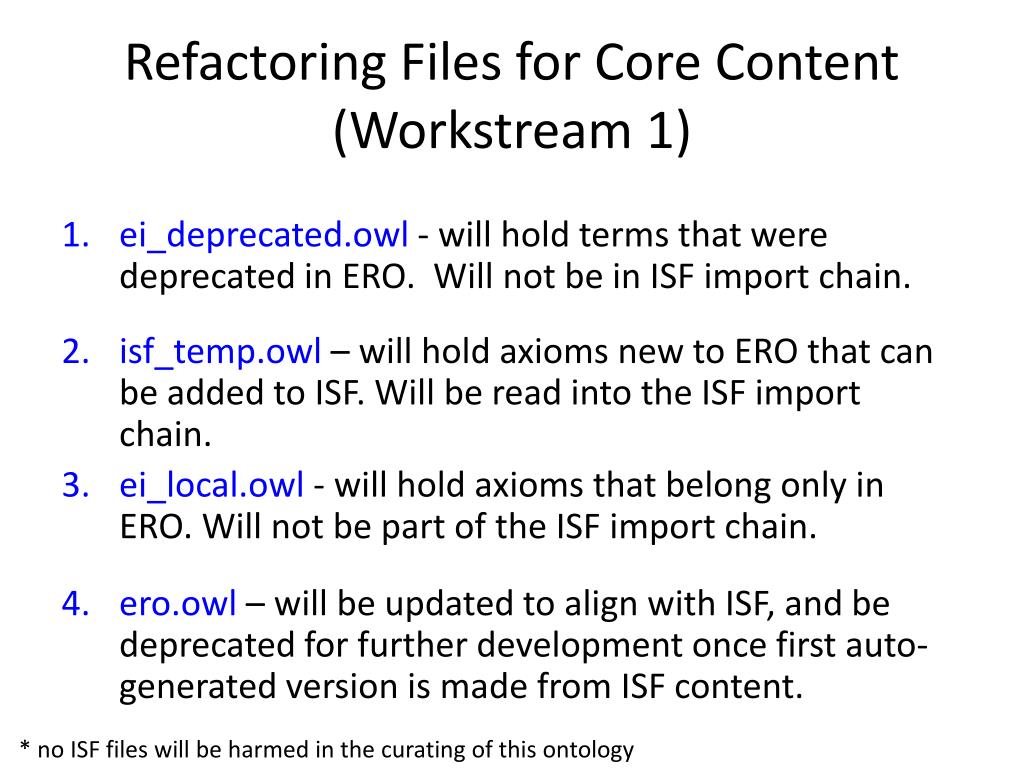 Refactoring Files for Core Content(Workstream 1) • ei_deprecated.owl- will hold terms that were deprecated in ERO. Will not be in ISF import chain. • isf_temp.owl– will hold axioms new to ERO that can be added to ISF. Will be read into the ISF import chain. • ei_local.owl- will hold axioms that belong only in ERO. Will not be part of the ISF import chain. • ero.owl– will be updated to align with ISF, and be deprecated for further development once first auto-generated version is made from ISF content. * no ISF files will be harmed in the curating of this ontology