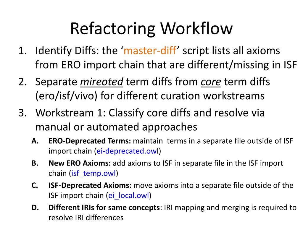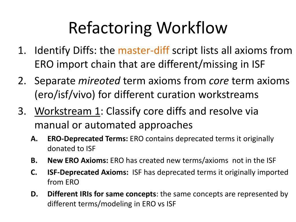 Refactoring Workflow • Identify Diffs: the master-diff script lists all axioms from ERO import chain that are different/missing in ISF • Separate mireoted term axioms from core term axioms (ero/isf/vivo) for different curation workstreams • Workstream 1: Classify core diffs and resolve via manual or automated approaches • ERO-Deprecated Terms: ERO contains deprecated terms it originally donated to ISF • New ERO Axioms:ERO has created new terms/axioms not in the ISF • ISF-Deprecated Axioms: ISF has deprecated terms it originally imported from ERO • Different IRIs for same concepts: the same concepts are represented by different terms/modeling in ERO vs ISF