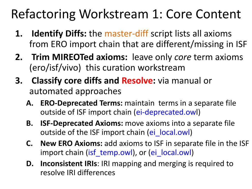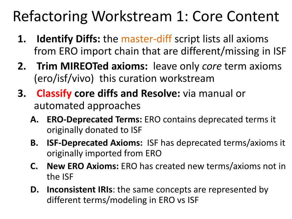 Refactoring Workstream 1: Core Content • Identify Diffs: the master-diff script lists all axioms from ERO import chain that are different/missing in ISF • Trim MIREOTed axioms: leave only coreterm axioms (ero/isf/vivo) this curation workstream • Classifycore diffs and Resolve: via manual or automated approaches • ERO-Deprecated Terms: ERO contains deprecated terms it originally donated to ISF • ISF-Deprecated Axioms: ISF has deprecated terms/axioms it originally imported from ERO • New ERO Axioms:ERO has created new terms/axioms not in the ISF • Inconsistent IRIs: the same concepts are represented by different terms/modeling in ERO vs ISF
