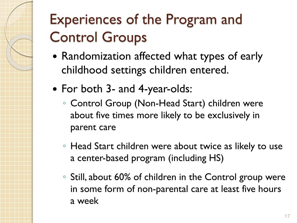 Early Care Experiences (cont.) After that first year: • By the second year, the care experiences did not vary much for the 3-year old cohort: • 50% of the control group and 63% of program group in Head Start, Quality of care was similar • Minimal differences in K, 1st, or 3rd grade experiences for program and control group • Both groups were in schools with large populations of children receiving free- and reduced-price lunch and minority children. Statewide test scores were about average for the state in which program was located.