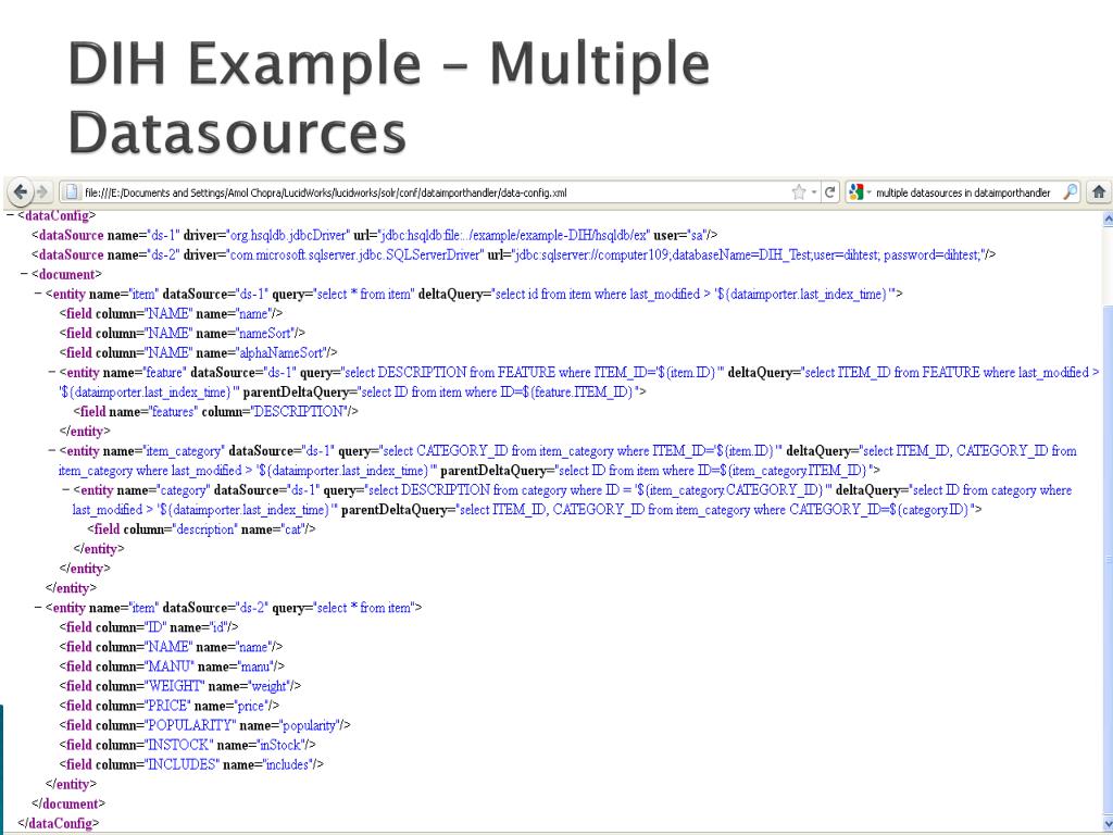 DIH Example • Create an XML file called DIH_Test.xml for importing into SOLR • Modify solrconfig.xml file to instruct SOLR to import data as per the file DIH_Test.xml