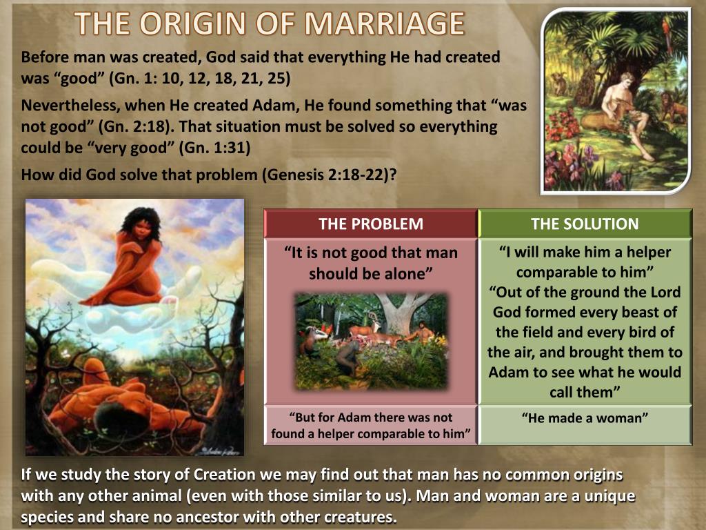 THE ORIGIN OF MARRIAGE Before man was created, God said that everything He had created was “good” (Gn. 1: 10, 12, 18, 21, 25) Nevertheless, when He created Adam, He found something that “was not good” (Gn. 2:18). That situation must be solved so everything could be “very good” (Gn. 1:31) How did God solve that problem (Genesis 2:18-22)? If we study the story of Creation we may find out that man has no common origins with any other animal (even with those similar to us). Man and woman are a unique species and share no ancestor with other creatures.