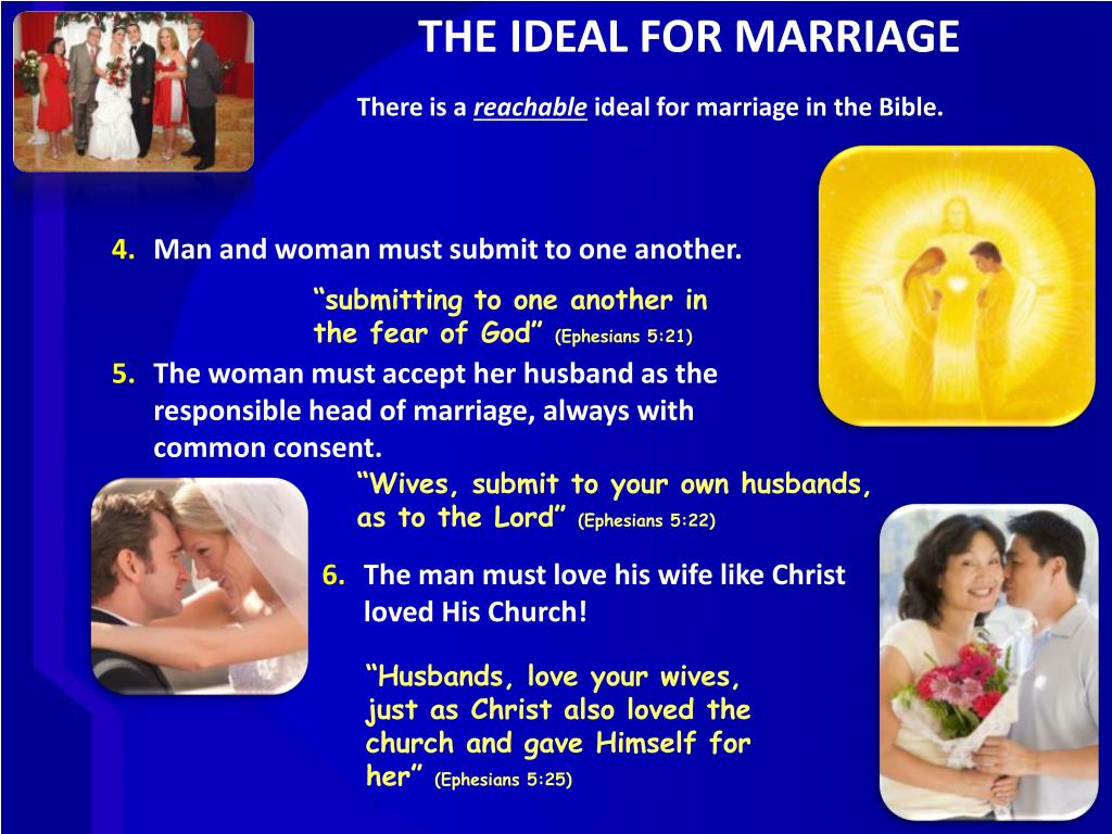THE IDEAL FOR MARRIAGE There is a reachable ideal for marriage in the Bible. Man and woman must submit to one another. “submitting to one another in the fear of God” (Ephesians 5:21) The woman must accept her husband as the responsible head of marriage, always with common consent. “Wives, submit to your own husbands, as to the Lord” (Ephesians 5:22) The man must love his wife like Christ loved His Church! “Husbands, love your wives, just as Christ also loved the church and gave Himself for her” (Ephesians 5:25)