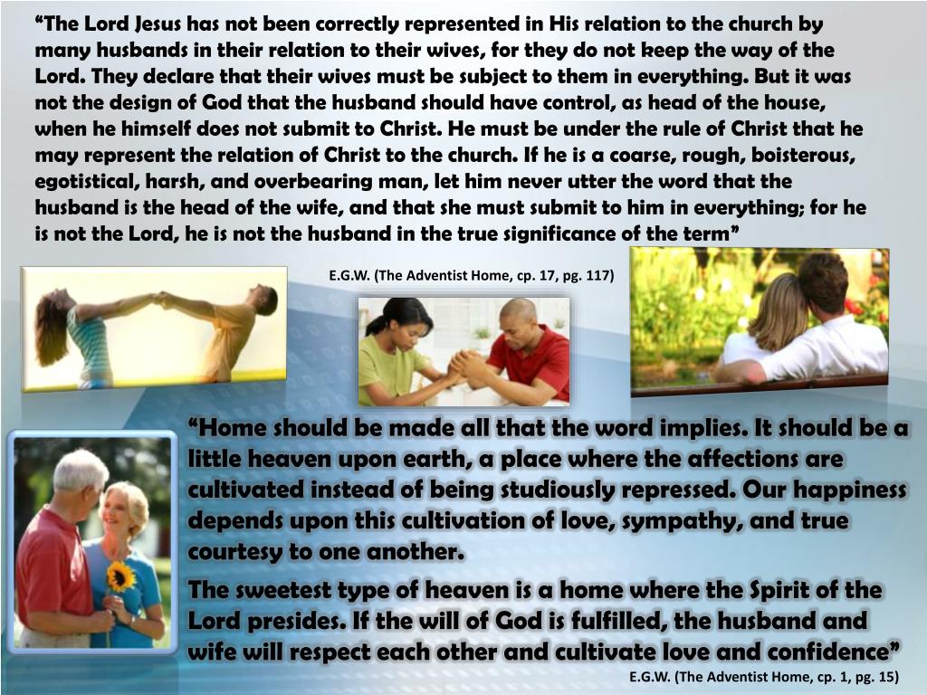 “The Lord Jesus has not been correctly represented in His relation to the church by many husbands in their relation to their wives, for they do not keep the way of the Lord. They declare that their wives must be subject to them in everything. But it was not the design of God that the husband should have control, as head of the house, when he himself does not submit to Christ. He must be under the rule of Christ that he may represent the relation of Christ to the church. If he is a coarse, rough, boisterous, egotistical, harsh, and overbearing man, let him never utter the word that the husband is the head of the wife, and that she must submit to him in everything; for he is not the Lord, he is not the husband in the true significance of the term” E.G.W. (The Adventist Home, cp. 17, pg. 117) “Home should be made all that the word implies. It should be a little heaven upon earth, a place where the affections are cultivated instead of being studiously repressed. Our happiness depends upon this cultivation of love, sympathy, and true courtesy to one another. The sweetest type of heaven is a home where the Spirit of the Lord presides. If the will of God is fulfilled, the husband and wife will respect each other and cultivate love and confidence” E.G.W. (The Adventist Home, cp. 1, pg. 15)