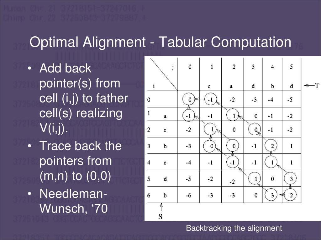 Optimal Alignment - Tabular Computation • Add back pointer(s) from cell (i,j) to father cell(s) realizing V(i,j). • Trace back the pointers from (m,n) to (0,0) • Needleman-Wunsch, ‘70 Backtracking the alignment