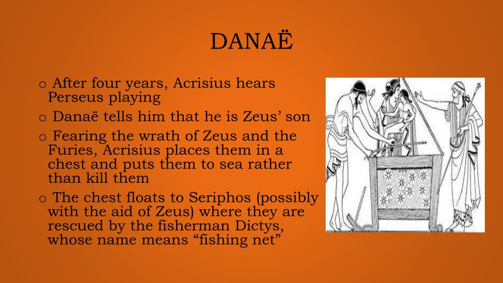DANAË • After four years, Acrisius hears Perseus playing • Danaë tells him that he is Zeus’ son • Fearing the wrath of Zeus and the Furies, Acrisius places them in a chest and puts them to sea rather than kill them • The chest floats to Seriphos (possibly with the aid of Zeus) where they are rescued by the fisherman Dictys, whose name means “fishing net”