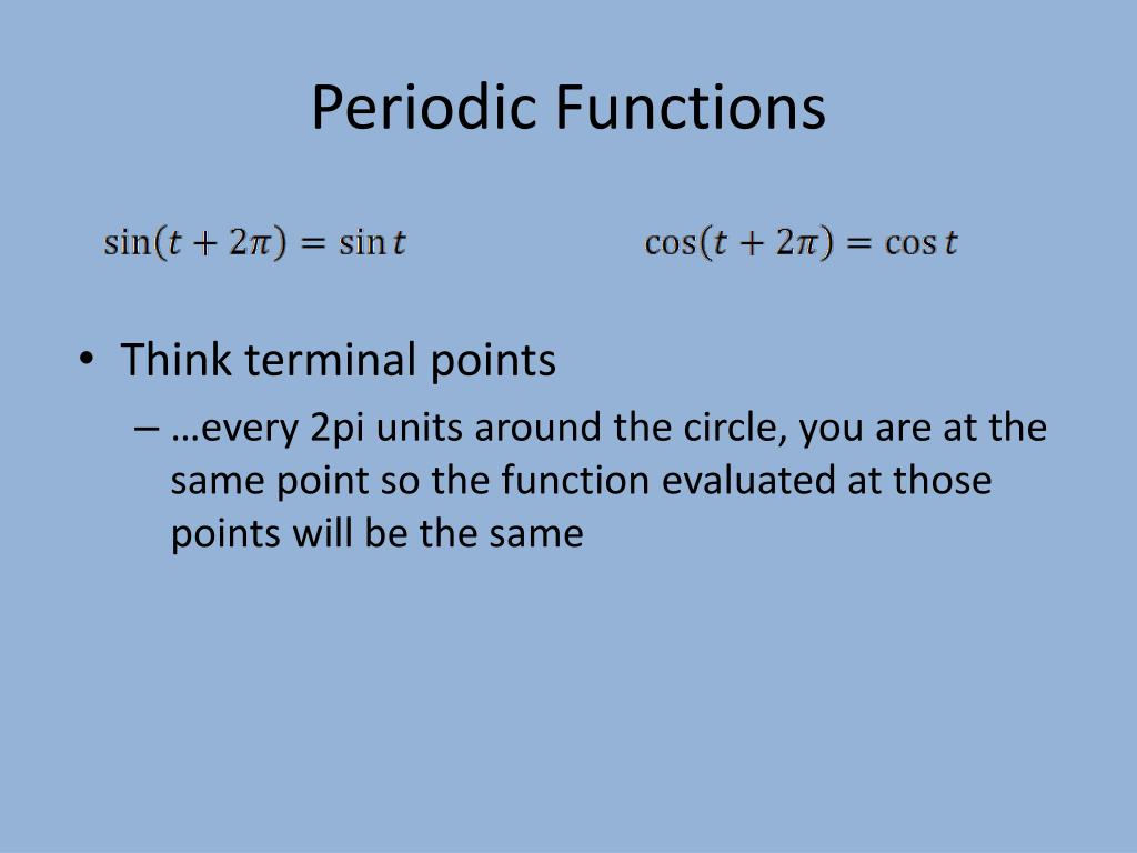 Periodic Functions • Think terminal points • …every 2pi units around the circle, you are at the same point so the function evaluated at those points will be the same