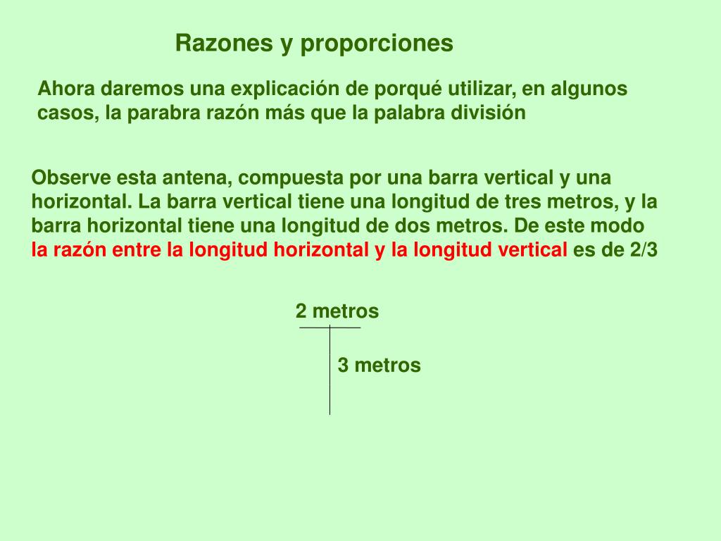 Razones y proporciones Ahora daremos una explicación de porqué utilizar, en algunos casos, la parabra razón más que la palabra división Observe esta antena, compuesta por una barra vertical y una horizontal. La barra vertical tiene una longitud de tres metros, y la barra horizontal tiene una longitud de dos metros. De este modo la razón entre la longitud horizontal y la longitud vertical es de 2/3 2 metros 3 metros