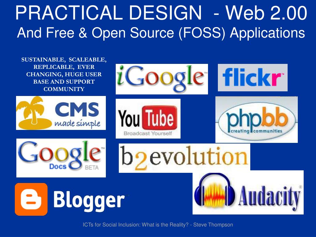 PRACTICAL DESIGN - Web 2.00And Free & Open Source (FOSS) Applications SUSTAINABLE, SCALEABLE, REPLICABLE, EVER CHANGING, HUGE USER BASE AND SUPPORT COMMUNITY ICTs for Social Inclusion: What is the Reality? - Steve Thompson