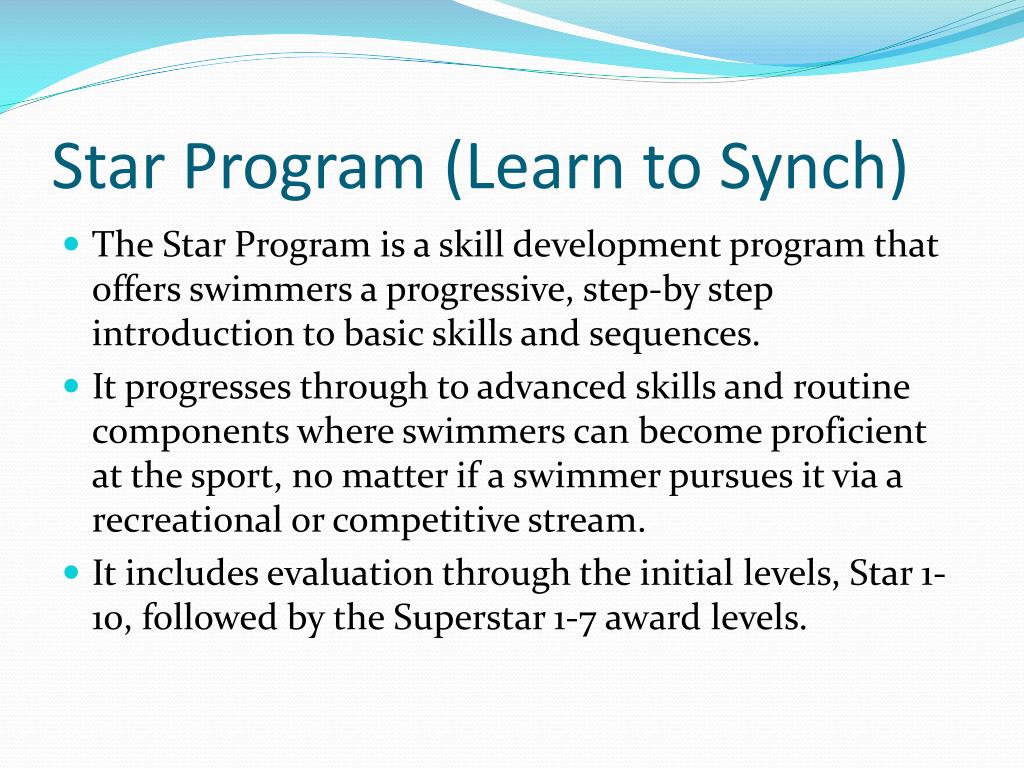 Star Program (Learn to Synch) • The Star Program is a skill development program that offers swimmers a progressive, step-by step introduction to basic skills and sequences. • It progresses through to advanced skills and routine components where swimmers can become proficient at the sport, no matter if a swimmer pursues it via a recreational or competitive stream. • It includes evaluation through the initial levels, Star 1-10, followed by the Superstar 1-7 award levels.