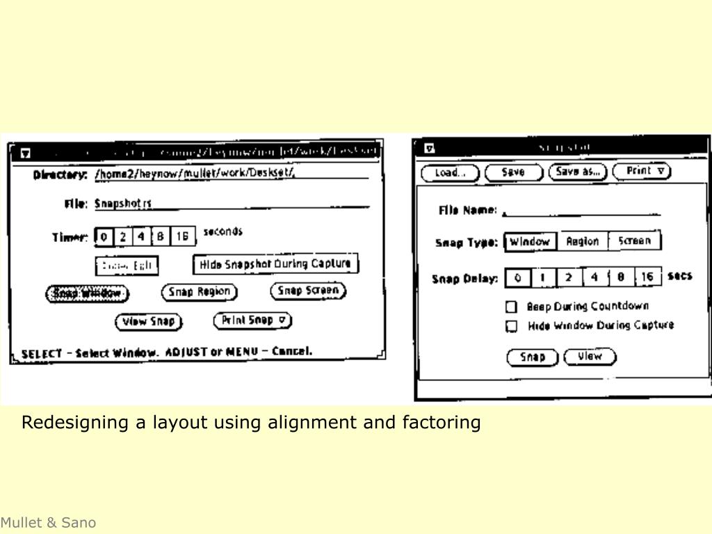 CRAPcontrast, repetition, alignment, proximity Major sources: Designing Visual Interfaces, Mullet & Sano, Prentice Hall / Robin Williams Non-Designers Design Book, Peachpit Press Slide deck by Saul Greenberg. Permission is granted to use this for non-commercial purposes as long as general credit to Saul Greenberg is clearly maintained. Warning: some material in this deck is used from other sources without permission. Credit to the original source is given if it is known.