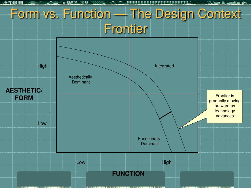 Form vs. Function — The Design Context Frontier Integrated High Aesthetically Dominant AESTHETIC/ FORM Frontier is gradually moving outward as technology advances Low Functionally-Dominant Low High FUNCTION