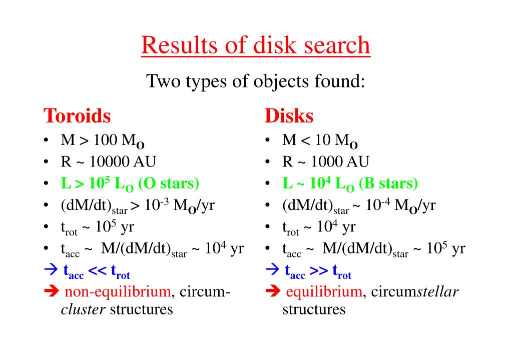 Toroids M > 100 MO R ~ 10000 AU L > 105 LO (O stars) (dM/dt)star > 10-3 MO/yr trot~ 105 yr tacc~ M/(dM/dt)star~ 104 yr tacc << trot non-equilibrium, circum-cluster structures Disks M < 10 MO R ~ 1000 AU L ~ 104 LO (B stars) (dM/dt)star ~ 10-4 MO/yr trot~ 104 yr tacc~ M/(dM/dt)star~ 105 yr tacc >> trot equilibrium, circumstellar structures Results of disk searchTwo types of objects found: