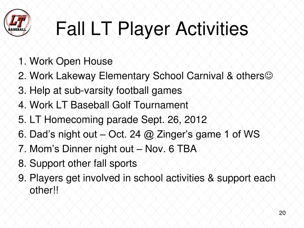 Fall LT Player Activities 1. Work Open House 2. Work Lakeway Elementary School Carnival & others 3. Help at sub-varsity football games 4. Work LT Baseball Golf Tournament 5. LT Homecoming parade Sept. 26, 2012 6. Dad’s night out – Oct. 24 @ Zinger’s game 1 of WS 7. Mom’s Dinner night out – Nov. 6 TBA 8. Support other fall sports 9. Players get involved in school activities & support each other!! 20