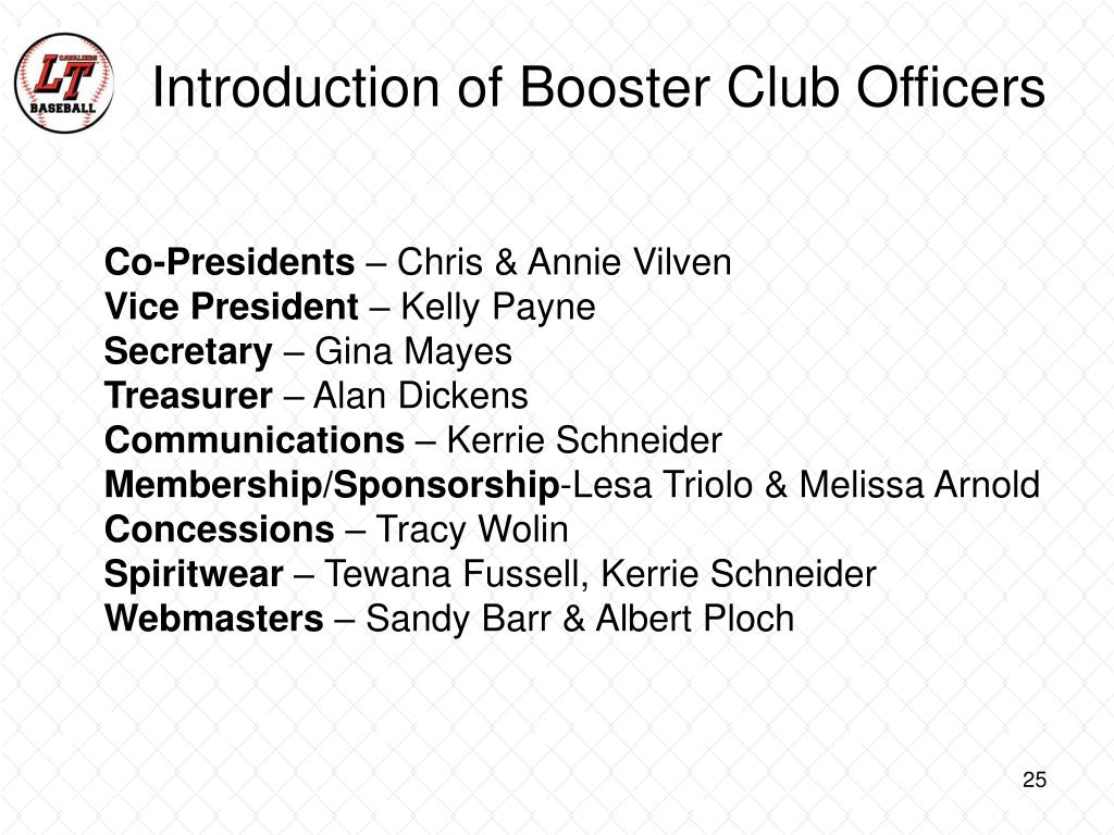 Introduction of Booster Club Officers Co-Presidents – Chris & Annie Vilven Vice President – Kelly Payne Secretary – Gina Mayes Treasurer – Alan Dickens Communications – Kerrie Schneider Membership/Sponsorship-Lesa Triolo & Melissa Arnold Concessions – Tracy Wolin Spiritwear – Tewana Fussell, Kerrie Schneider Webmasters – Sandy Barr & Albert Ploch