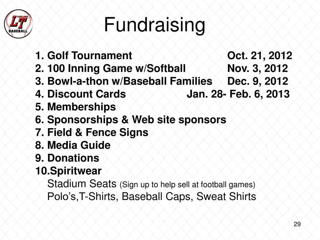 Fundraising • Golf Tournament Oct. 21, 2012 • 100 Inning Game w/Softball Nov. 3, 2012 • Bowl-a-thon w/Baseball Families Dec. 9, 2012 • Discount Cards Jan. 28- Feb. 6, 2013 • Memberships • Sponsorships & Web site sponsors • Field & Fence Signs • Media Guide • Donations • Spiritwear • Stadium Seats (Sign up to help sell at football games) • Polo’s,T-Shirts, Baseball Caps, Sweat Shirts