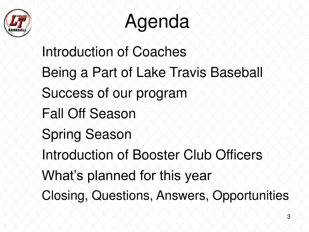 Agenda Introduction of Coaches Being a Part of Lake Travis Baseball Success of our program Fall Off Season Spring Season Introduction of Booster Club Officers What’s planned for this year Closing, Questions, Answers, Opportunities