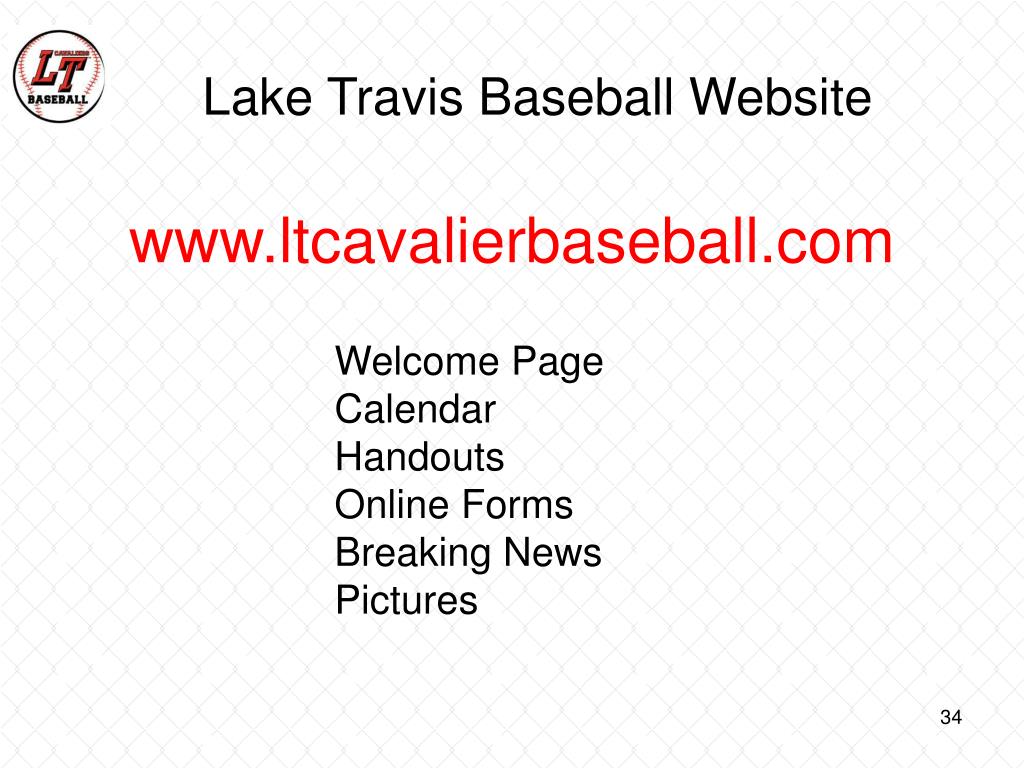 Lake Travis Baseball Website www.ltcavalierbaseball.com Welcome Page Calendar Handouts Online Forms Breaking News Pictures