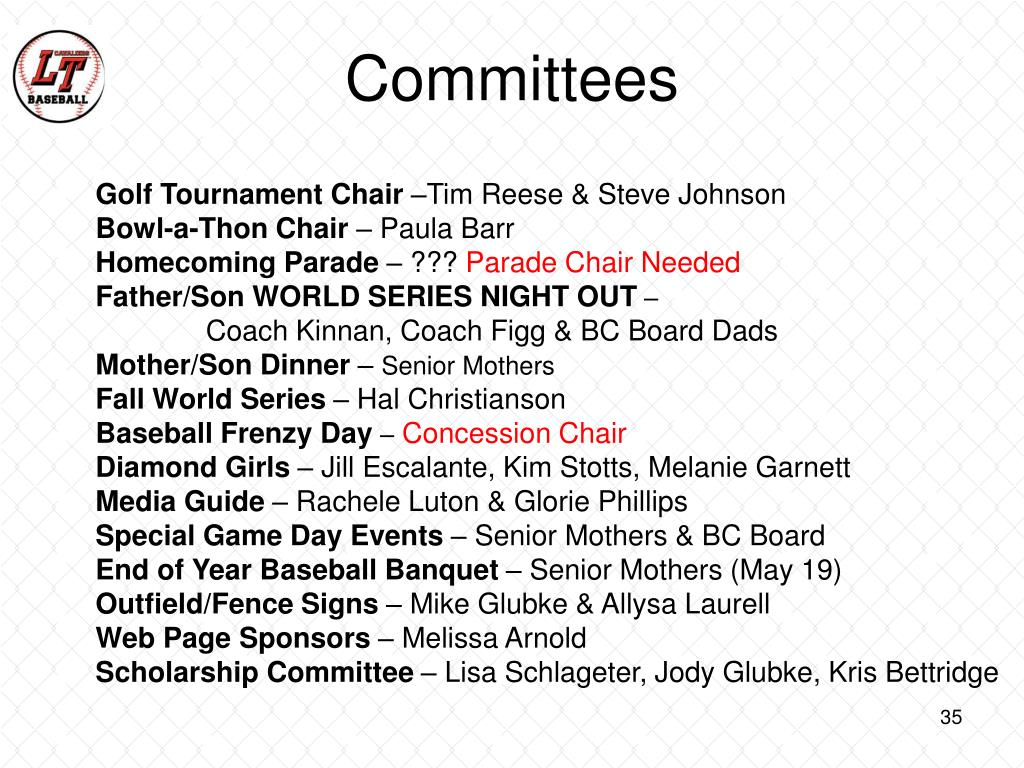 Committees Golf Tournament Chair –Tim Reese & Steve Johnson Bowl-a-Thon Chair – Paula Barr Homecoming Parade – ??? Parade Chair Needed Father/Son WORLD SERIES NIGHT OUT – Coach Kinnan, Coach Figg & BC Board Dads Mother/Son Dinner – Senior Mothers Fall World Series – Hal Christianson Baseball Frenzy Day–Concession Chair Diamond Girls – Jill Escalante, Kim Stotts, Melanie Garnett Media Guide – Rachele Luton & Glorie Phillips Special Game Day Events – Senior Mothers & BC Board End of Year Baseball Banquet – Senior Mothers (May 19) Outfield/Fence Signs – Mike Glubke & Allysa Laurell Web Page Sponsors – Melissa Arnold Scholarship Committee – Lisa Schlageter, Jody Glubke, Kris Bettridge