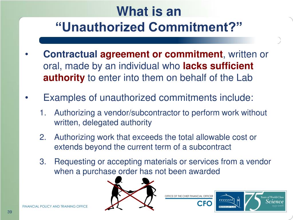What is an “Unauthorized Commitment?” • Contractual agreement or commitment, written or oral, made by an individual who lacks sufficient authority to enter into them on behalf of the Lab • Examples of unauthorized commitments include: • Authorizing a vendor/subcontractor to perform work without written, delegated authority • Authorizing work that exceeds the total allowable cost or extends beyond the current term of a subcontract • Requesting or accepting materials or services from a vendor when a purchase order has not been awarded