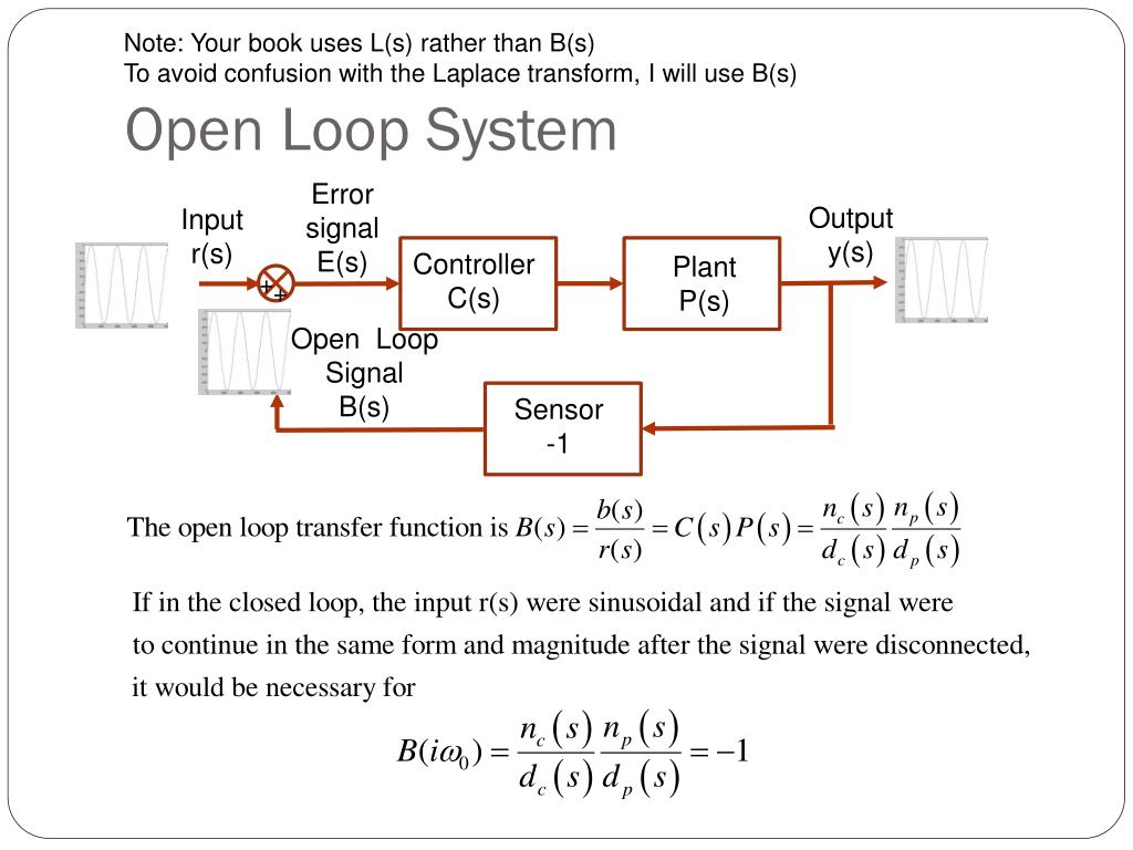 Note: Your book uses L(s) rather than B(s) To avoid confusion with the Laplace transform, I will use B(s) Open Loop System Error signal E(s) Output y(s) Input r(s) Controller C(s) Plant P(s) Open Loop Signal B(s) Sensor -1 + +