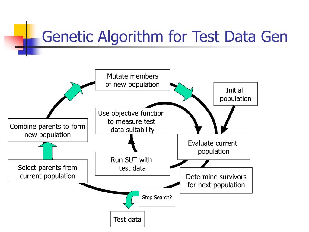 Genetic Algorithm for Test Data Gen Mutate members of new population Initial population Use objective function to measure test data suitability Combine parents to formnew population Evaluate current population Run SUT with test data Select parents fromcurrent population Determine survivorsfor next population Stop Search? Test data