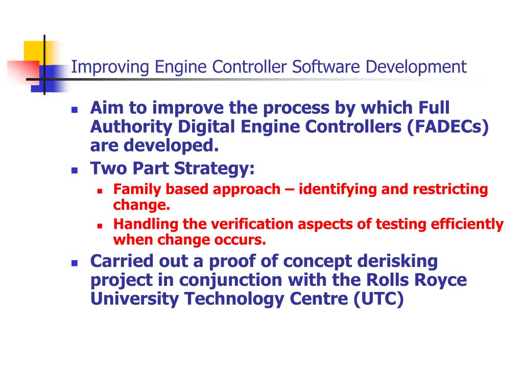 Improving Engine Controller Software Development • Aim to improve the process by which Full Authority Digital Engine Controllers (FADECs) are developed. • Two Part Strategy: • Family based approach – identifying and restricting change. • Handling the verification aspects of testing efficiently when change occurs. • Carried out a proof of concept derisking project in conjunction with the Rolls Royce University Technology Centre (UTC)