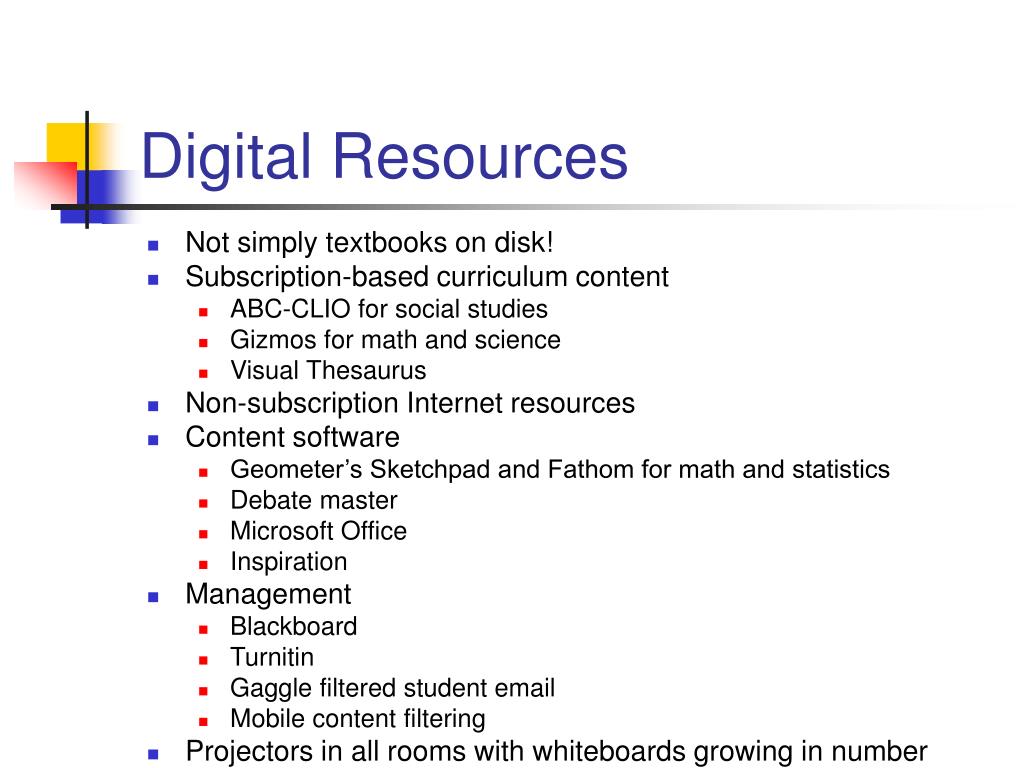 Digital Resources • Not simply textbooks on disk! • Subscription-based curriculum content • ABC-CLIO for social studies • Gizmos for math and science • Visual Thesaurus • Non-subscription Internet resources • Content software • Geometer’s Sketchpad and Fathom for math and statistics • Debate master • Microsoft Office • Inspiration • Management • Blackboard • Turnitin • Gaggle filtered student email • Mobile content filtering • Projectors in all rooms with whiteboards growing in number