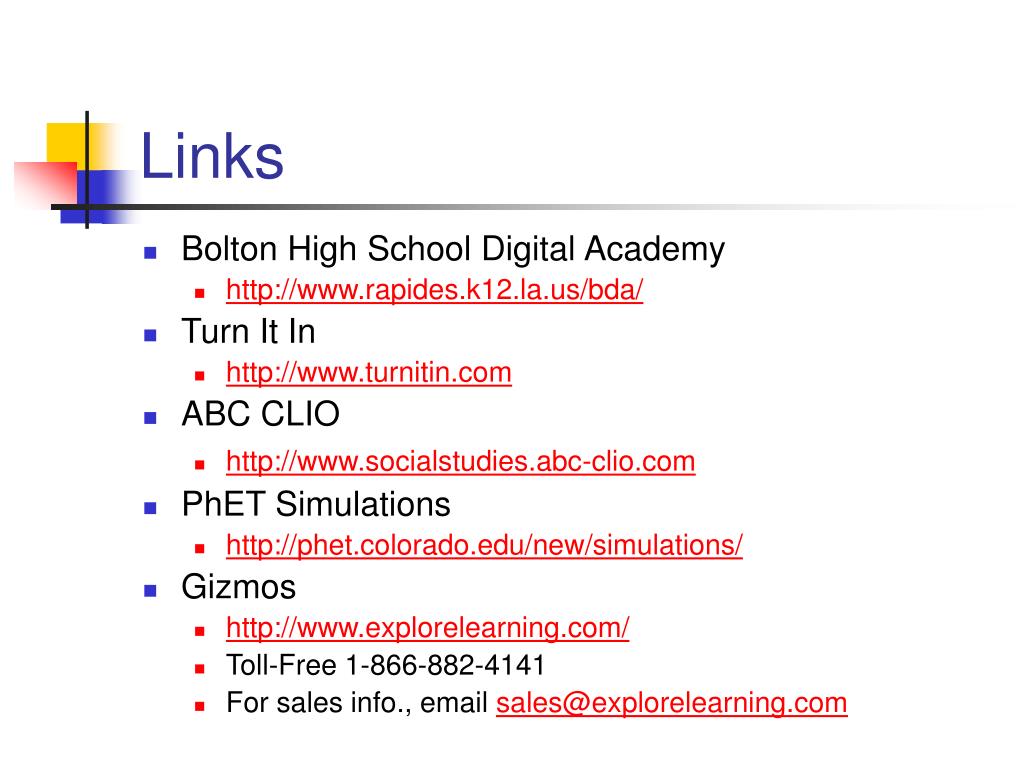 Links • Bolton High School Digital Academy • http://www.rapides.k12.la.us/bda/ • Turn It In • http://www.turnitin.com • ABC CLIO • http://www.socialstudies.abc-clio.com • PhET Simulations • http://phet.colorado.edu/new/simulations/ • Gizmos • http://www.explorelearning.com/ • Toll-Free 1-866-882-4141 • For sales info., email sales@explorelearning.com