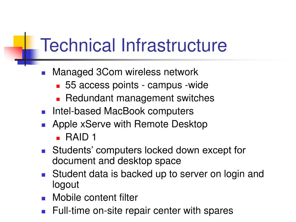 Technical Infrastructure • Managed 3Com wireless network • 55 access points - campus -wide • Redundant management switches • Intel-based MacBook computers • Apple xServe with Remote Desktop • RAID 1 • Students’ computers locked down except for document and desktop space • Student data is backed up to server on login and logout • Mobile content filter • Full-time on-site repair center with spares