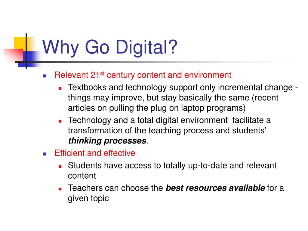 Why Go Digital? • Relevant 21st century content and environment • Textbooks and technology support only incremental change - things may improve, but stay basically the same (recent articles on pulling the plug on laptop programs) • Technology and a total digital environment facilitate a transformation of the teaching process and students’ thinking processes. • Efficient and effective • Students have access to totally up-to-date and relevant content • Teachers can choose the best resources available for a given topic